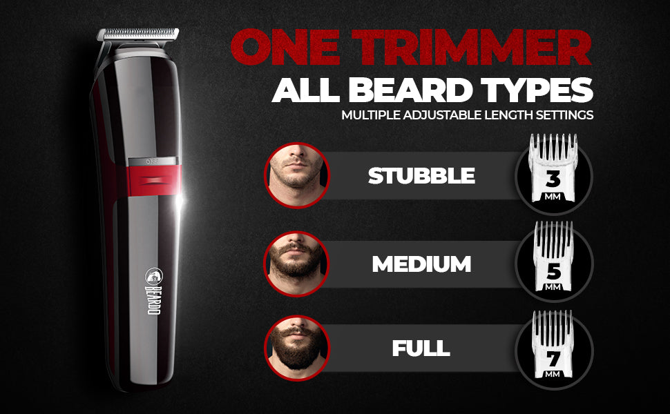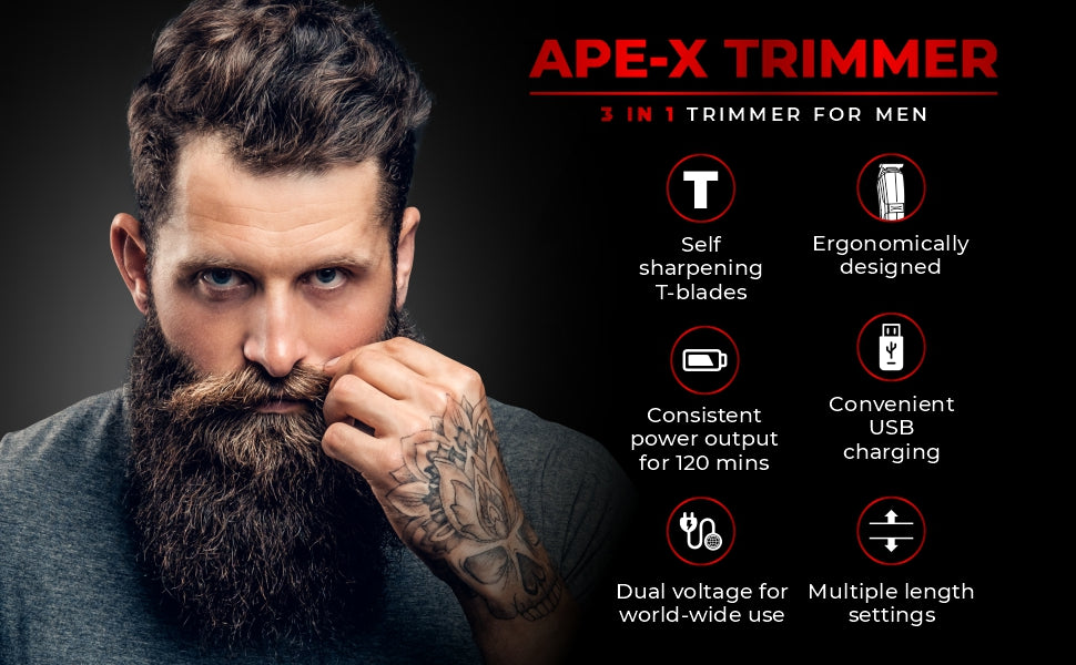 Beardo's Ape-X 3-in-1 Multipurpose trimmer is armed with a variety of length settings suitable for beards of all lengths, thicknesses and types. It is equipped with razor sharp and highly durable carbon steel blades for clean, precise trims. Its T-blades ensure an even trim even in tricky areas unreached by regular trimmers.