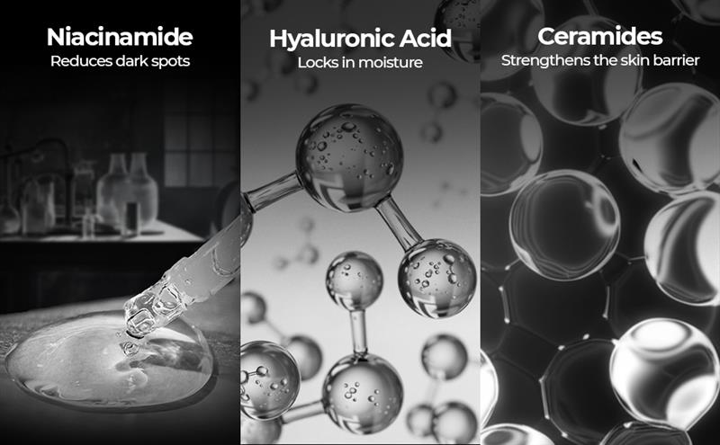 Combines three potent skincare ingredients to hydrate, repair, protects & brightens. Hyaluronic Acid locks in moisture, Niacinamide reduces dark spots, and Ceramides strengthen the skin barrier.