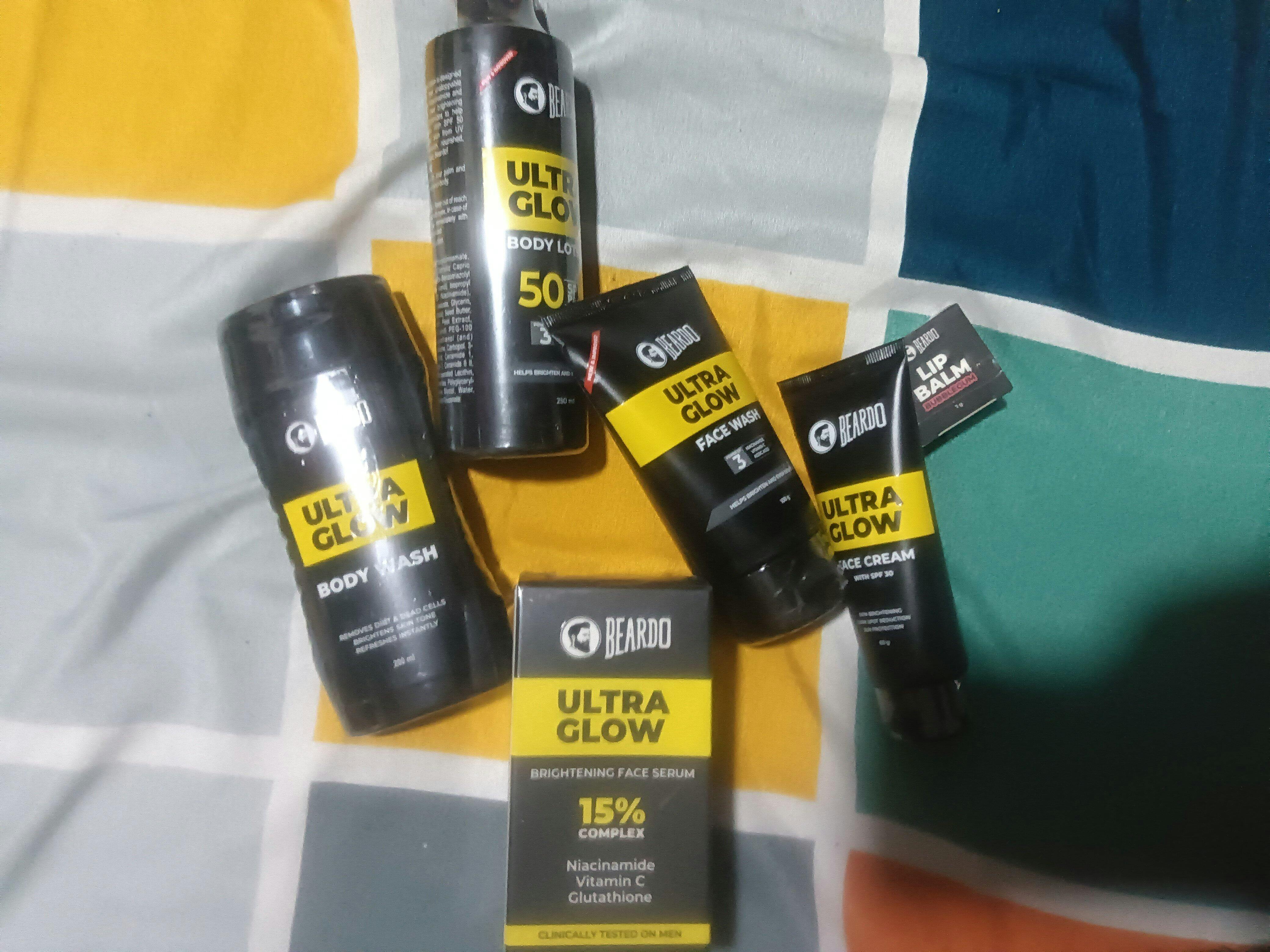 What’s included in the kit?Ultra Glow Face Wash, Brightening Serum (15%), Face Cream SPF 30, Body Wash, Body Lotion SPF 50, and Bubblegum Lip Balm.
